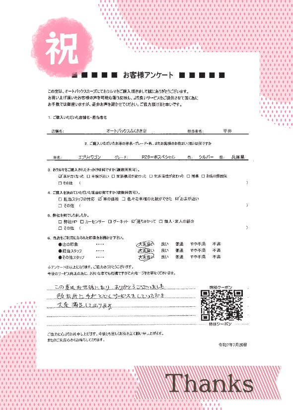 保証も整備もしっかり行わせていただき、整備内容にご満足いただけました